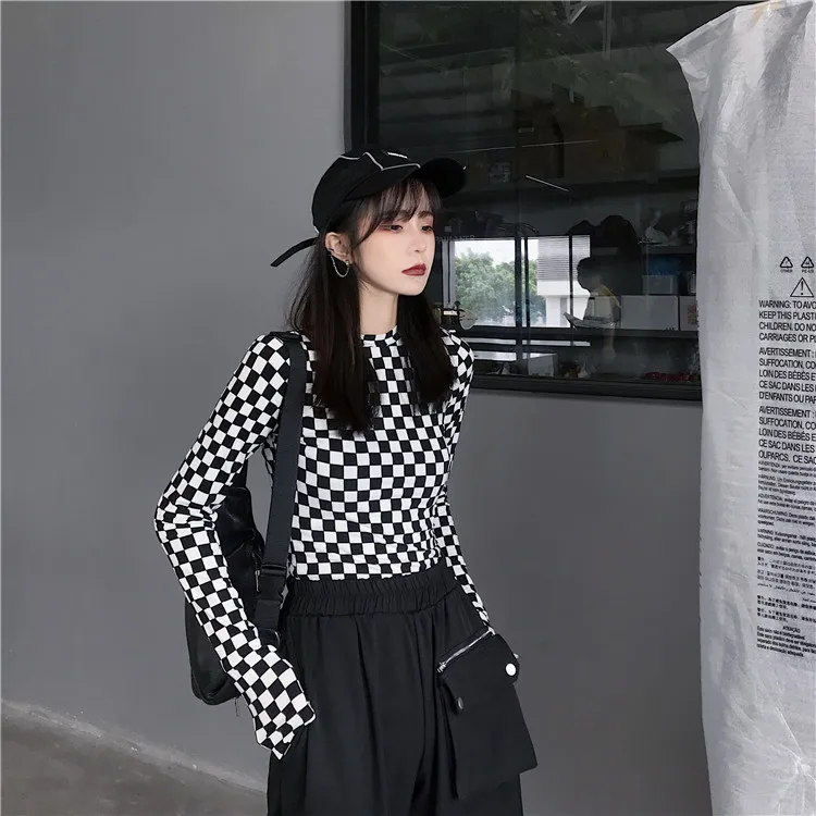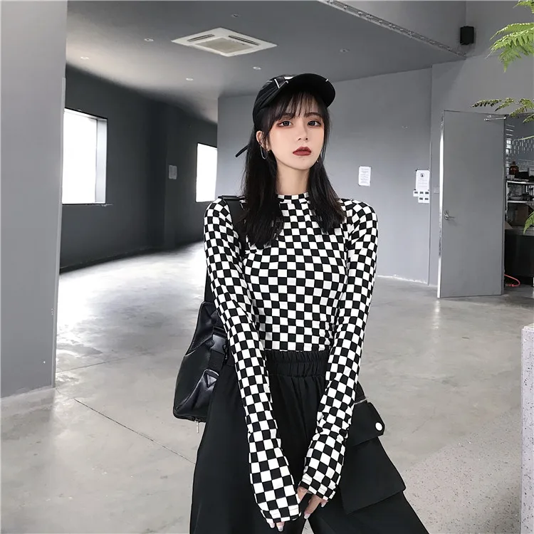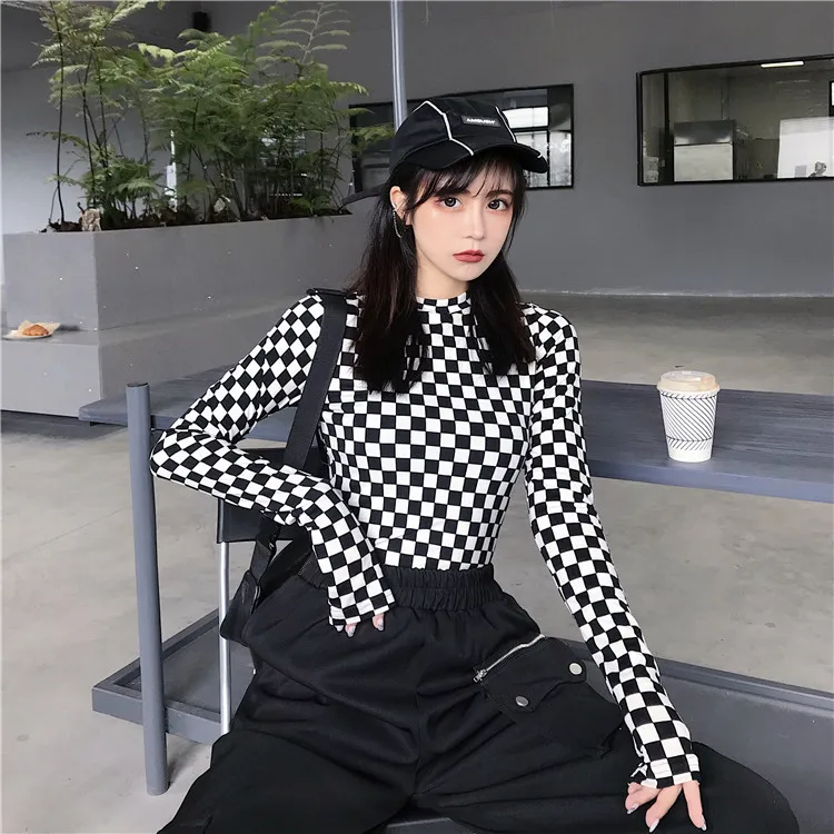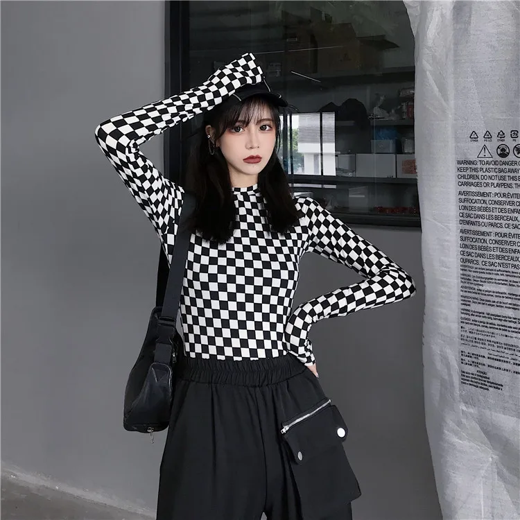 Be the first to review “Black & White Checkered Mesh Top Long Sleeve Mock Neck Cropped Top Women’s T-shirts Altgirl Outfit /”